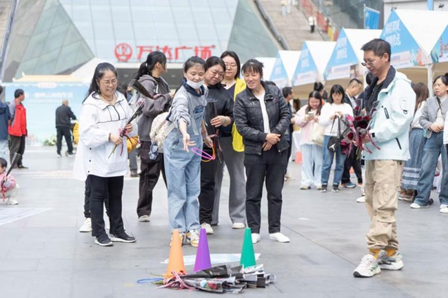 体验展不止有“看”和“尝”,更有“玩”和“跳”。随着欢快的音乐响起,身着民族服饰的演员跳起民族舞,并热情邀请过往市民加入打跳。现场市民很快被欢快的节奏感染,加入舞圈,手拉手围成一个个同心圆。一旁的互动区同样热闹,投壶、套圈等小游戏前排起了长队,每完成一次挑战,工作人员就送上一份来自嵩明的伴手礼。