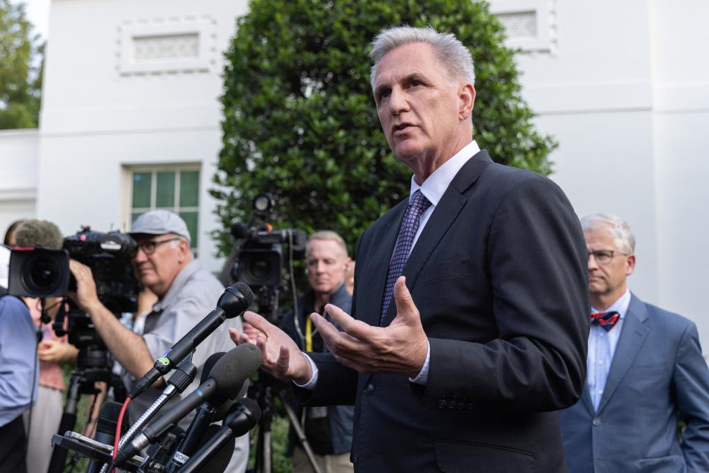 2023年5月22日,在美国华盛顿白宫,时任国会众议长、共和党人凯文·麦卡锡就债务上限问题与美国总统拜登谈判后回答记者提问。新华社发(亚伦摄)