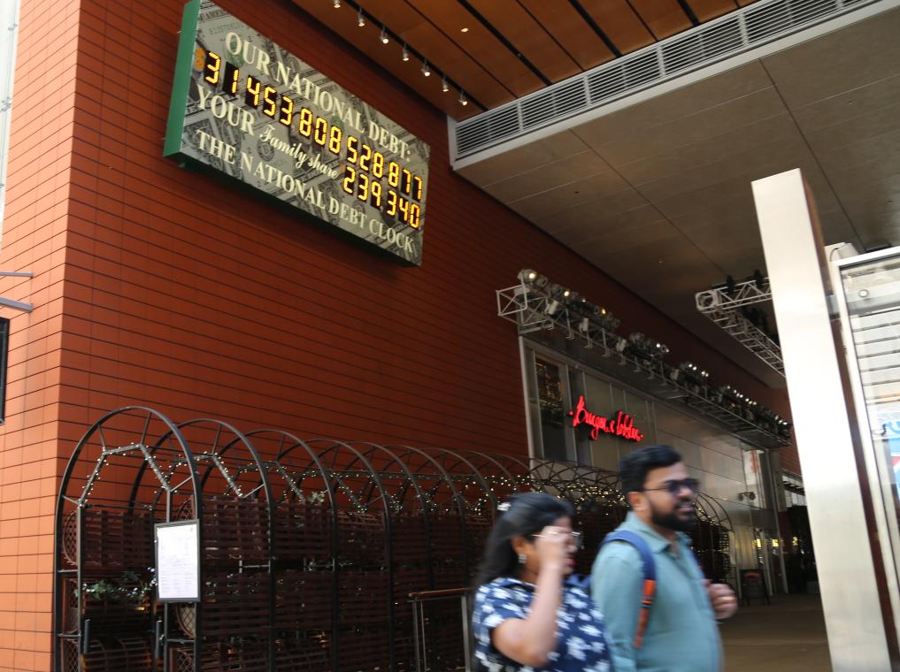 2023年5月29日,人们经过美国纽约曼哈顿的“国债钟”。“国债钟”是一个大型计数器,它实时更新美国的公共债务总额,并显示出每个美国家庭所要负担的数额。新华社记者刘亚南摄