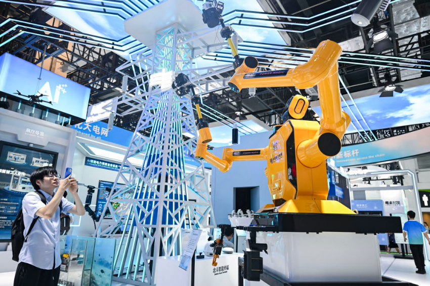 7月28日,在2025世界人工智能大会上,参观者在中国南方电网展区拍摄“悟空”带电作业机器人。新华社记者 陈浩明 摄