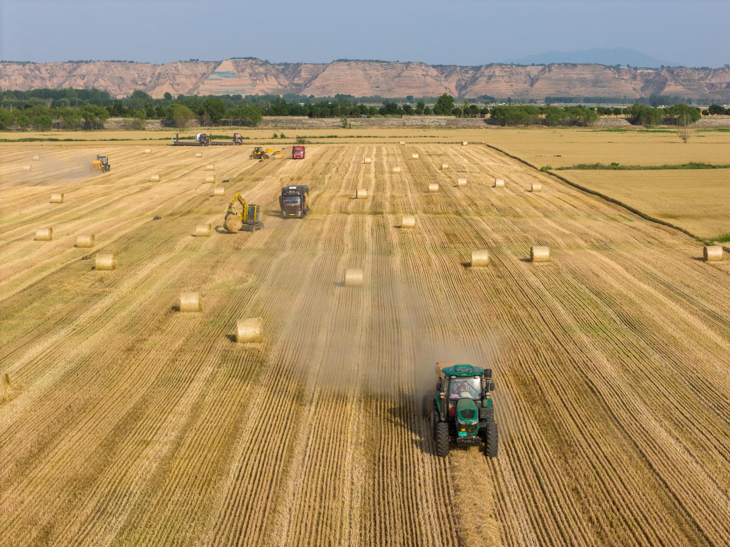 △据国家统计局发布的数据,2025年全国夏粮总产量14973.8万吨,实现稳产丰收。图为今年6月,山西运城裴庄镇黄河滩涂上,农机手忙着实施小麦秸秆打捆和装车运输作业。