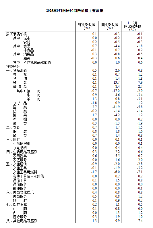 2025年9月份,全国居民消费价格同比下降0.3%。其中,城市下降0.2%,农村下降0.5%;食品价格下降4.4%,非食品价格上涨0.7%;消费品价格下降0.8%,服务价格上涨0.6%。1—9月平均,全国居民消费价格比上年同期下降0.1%。