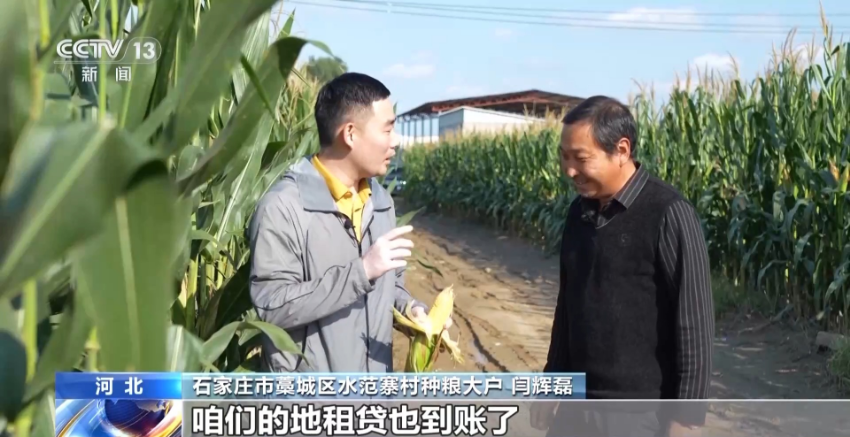 石家庄市藁城区水范寨村种粮大户 闫辉磊:咱今年的玉米长势特别好,一亩地能达到2800斤。咱们的地租贷也到账了,一会我就给你转地租。