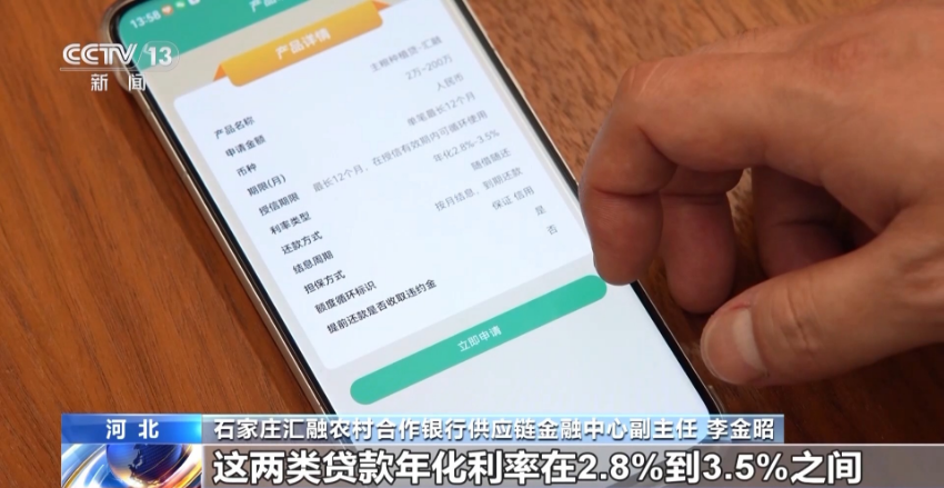 石家庄汇融农村合作银行供应链金融中心副主任 李金昭:我们根据土地流转合同,为他发放了120万元低息无抵押贷款。农民还能根据需要申请“农资贷”。这两类贷款年化利率在2.8%到3.5%之间,而且随用随还。