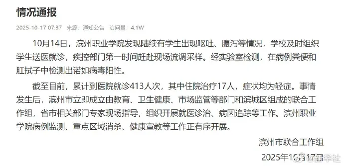 近日,有网友反映,山东滨州职业学院多名学生出现呕吐、腹泻等症状。10月17日,山东省滨州市联合工作组发布情况通报,10月14日,滨州职业学院发现陆续有学生出现呕吐、腹泻等情况,学校及时组织学生送医就诊,疾控部门第一时间赶赴现场流调采样。经实验室检测,在病例粪便和肛拭子中检测出诺如病毒阳性。