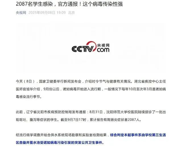 此前,辽宁省沈阳市疾病预防控制局发布通报:8月31日,沈阳师范大学校医院陆续接诊了一批出现呕吐、腹泻等症状的学生。截至9月7日17时,累计报告有胃肠炎症状者2087人。