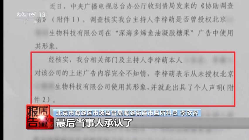 北京市海淀区市场监管部门经过向中央广播电视总台核实,最终确认,总台主持人李梓萌从未代言这款鱼油产品,也未授权使用其形象进行宣传。
