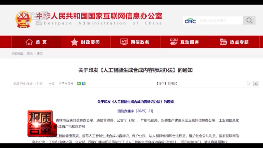 中央财经大学法学院教授 刘双舟:这个文件出来以后就明确要求AI生成的和合成的内容要加标识,应该加两个方面的标识。一方面是显性的标识,就是公众能够通过内容的标识能够判断出来,这是AI生成的内容。还有一些隐性的标识,对元数据上要加,要标明数据的来源、用途和谁生成的。