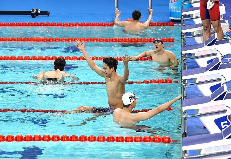 △男子4×200米自由泳接力决赛,张展硕领衔山东队获得冠军。