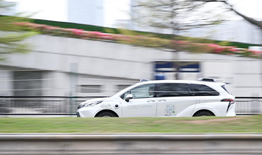 2025年3月11日,配备有安全员的自动驾驶示范运营专线出租车行驶在广州塔附近道路上。新华社记者 邓华 摄
