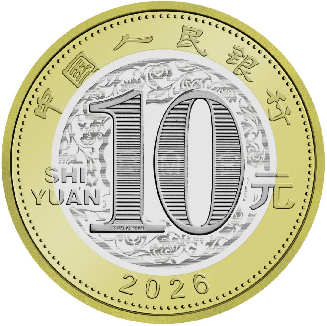 双色铜合金纪念币正面图案为“中国人民银行”“10元”字样,汉语拼音字母“SHIYUAN”及年号“2026”,底纹衬以团花图案。