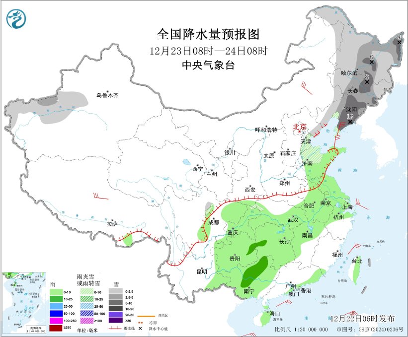 12月23日8时至24日8时,东北地区、新疆南疆西部山区、华北东部、山东北部等地部分地区有小到中雪或雨夹雪,其中,黑龙江中东部、吉林中部、辽宁东部局地大到暴雪(10~12毫米)。黄淮东部、江淮、江汉大部、江南北部和西部、西南地区东部、广西、广东东南部沿海、海南岛东部、台湾岛东部等地部分地区有小雨,其中,湖南西部、贵州东北部、广西中部等地部分地区有中雨。内蒙古中东部、辽东半岛、西藏中北部等地部分地区有4~6级风;渤海、渤海海峡、黄海大部海域、东海西部海域、台湾海峡、巴士海峡、南海北部海域将有6~7级大风、阵风8~9级。