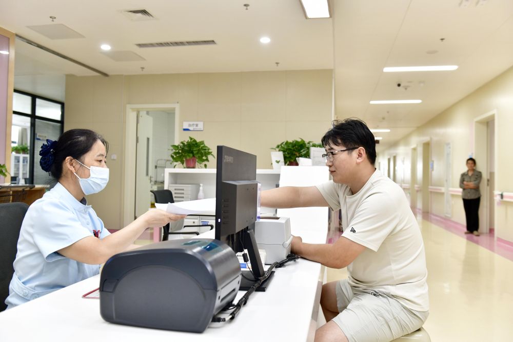 2025年8月21日,在郓城县人民医院产科护士站,工作人员在为产妇家属做诊间医保结算。新华社记者 郭绪雷 摄