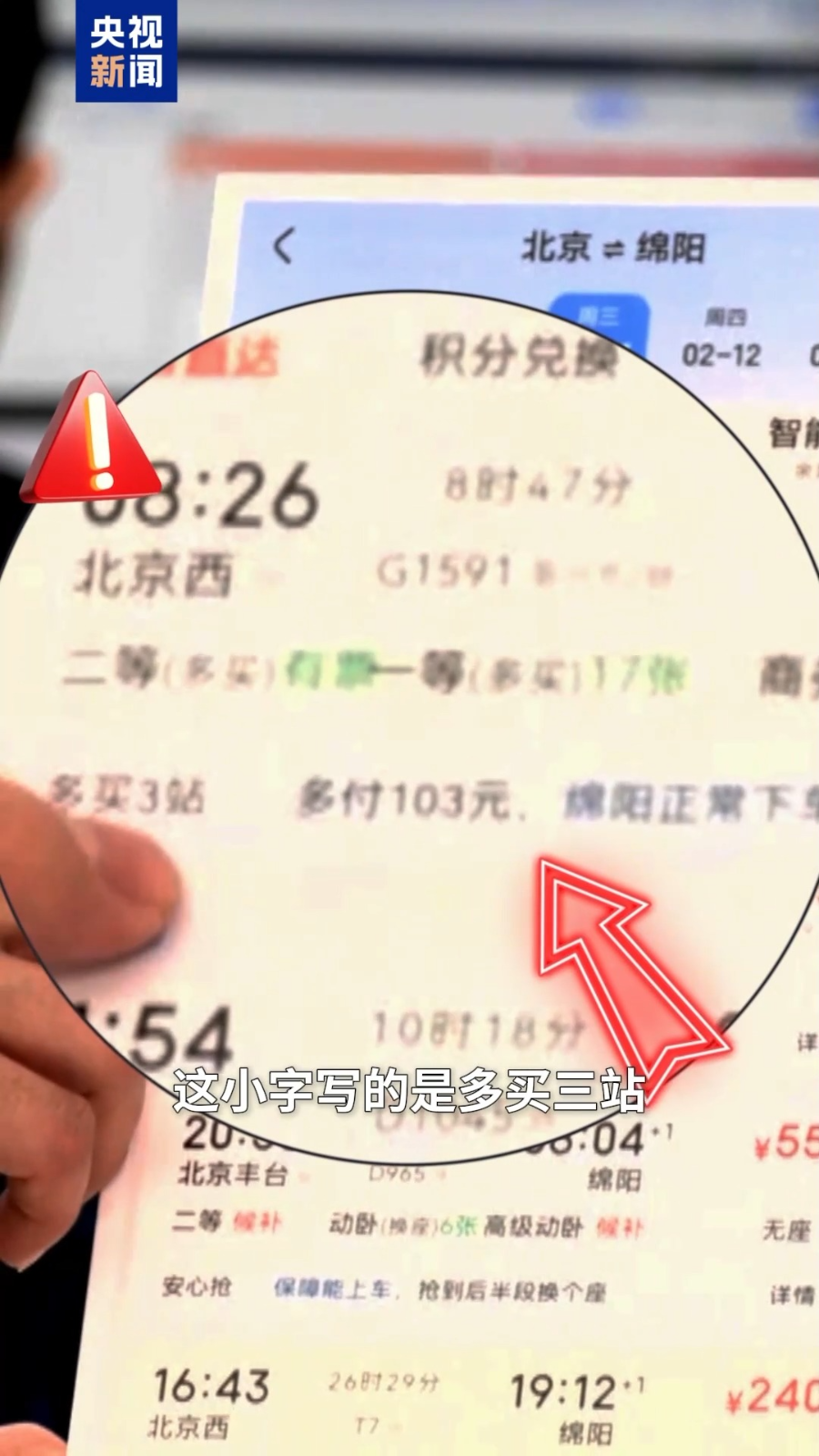 铁科院电子所数智客运研究室 赵千谊:这张图仔细看,虽然抢票软件显示有票,但是其实底下还有一行小字,这小字写的是:多买三站,多付103元。什么意思?就是引导您买长乘短,也就让旅客多花钱买更远的车站,然后还在自己想要下车的那一站下车。我们其实非常不提倡旅客这样,因为您多买的那段您多花了钱,然后那段座位的资源其实就是白白浪费了,而真正有需求的旅客他又买不到车票了。还有一种,底下还有一种小字:保障能上车,抢后半段。这就是抢票软件的另一个套路,它在诱导旅客买短乘长。买短乘长是什么意思?就是让旅客买一张短途票先上车,然后再补票到自己的目的地。这种做法风险特别大,因为我们每趟列车的承载的人数是有一个安全上限的,如果大家都这么做的话,列车就会超载,严重的时候会导致列车的中途停驶,就会影响了整条线路的运行,所有的旅客的行程都会受到影响。还有一种,有些抢票软件它推荐了一些明显是非常不合理的换乘方案,从而显示有票,实际上它的换乘时间非常短,如果旅客稍微动作慢一点,就很可能导致后面的列车会漏乘。