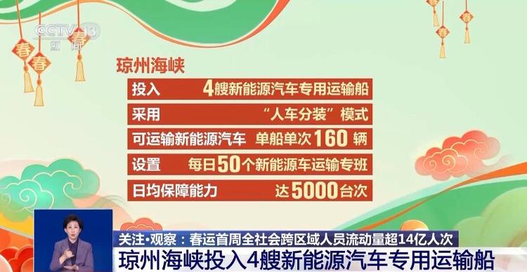 海南省交通运输厅有关负责人介绍,琼州海峡投入4艘新能源汽车专用运输船,采用“人车分装”模式,单船单次可运输160辆新能源汽车,每日设置50个新能源车运输专班,日均保障能力达5000台次。
