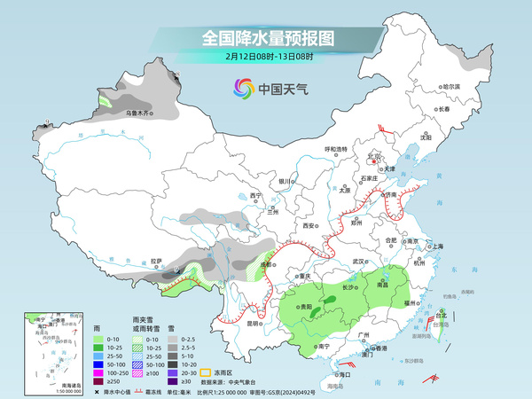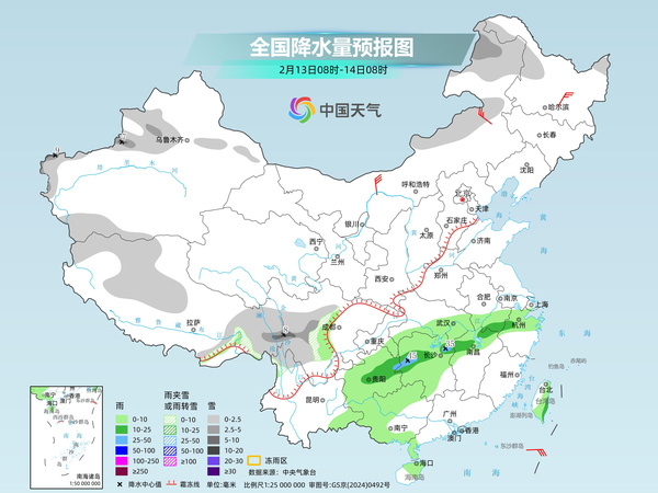 后天(2月13日),内蒙古东部、黑龙江北部、新疆沿天山地区和南疆西部山区、西藏东南部、川西高原等地部分地区有小雪或雨夹雪,其中,内蒙古东北部、新疆伊犁河谷和南疆西部山区、西藏东部、川西高原南部等地部分地区有中到大雪。贵州、湖南、湖北南部、江西北部、安徽南部、浙江北部、广西西部和北部、台湾岛等地部分地区有小到中雨,其中,湖南中部、贵州东北部等地部分地区有大雨。