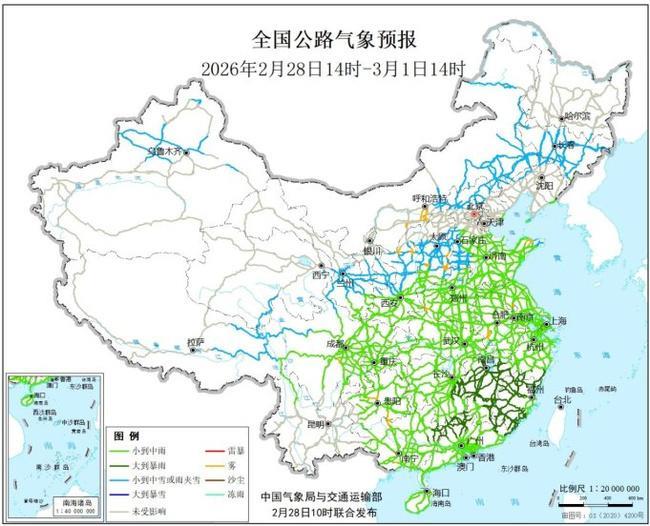 全国公路气象预报图(2月28日14时至3月1日14时)