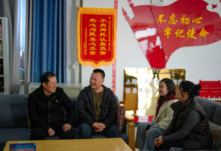 2026年2月9日,在新疆伊犁哈萨克自治州新源县,全国人大代表木沙江·海拉特(左一)在克热格塔斯村党群服务中心与当地第一书记刘华兵(左二),干部居丽迪孜·阿依塔恩(右二)、阿依江·巴合提江交流。 新华社记者 辛悦卫 摄