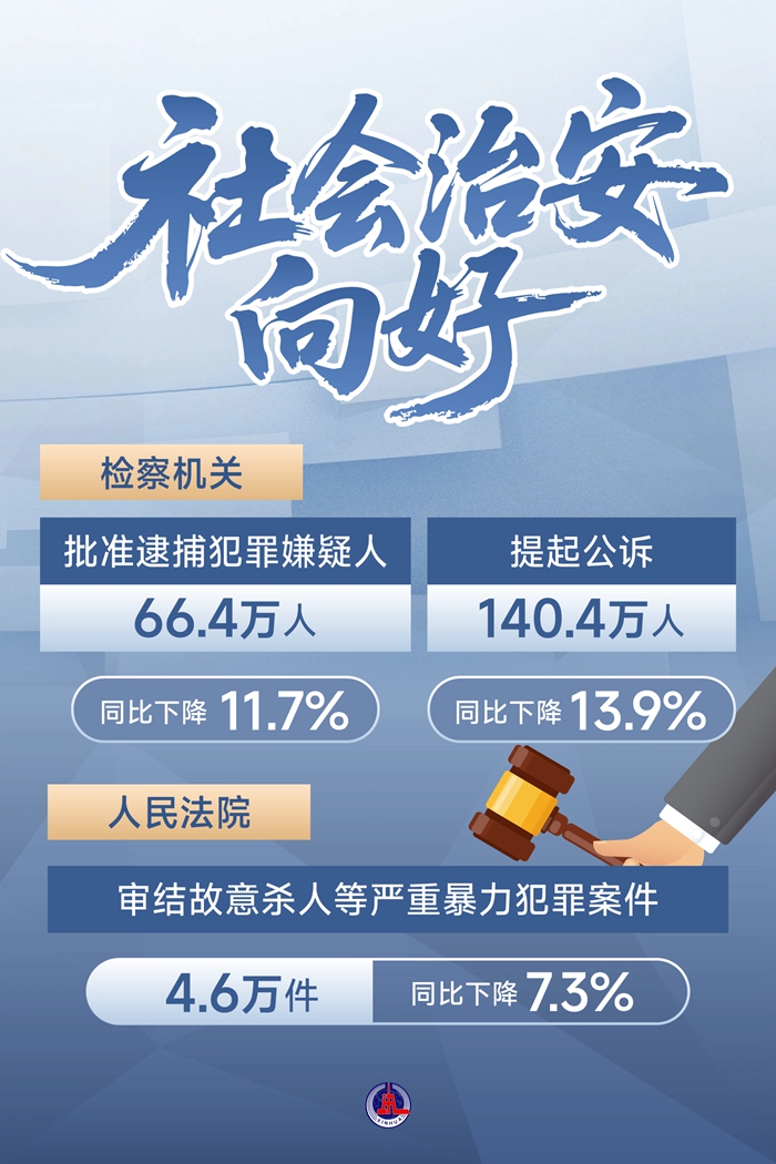 ——社会治安向好,检察机关批捕、起诉人数均同比下降10%以上。