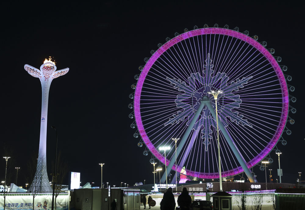 2025年2月14日,第九届亚洲冬季运动会闭幕式在哈尔滨举行。这是当天在哈尔滨冰雪大世界拍摄的亚冬会主火炬和摩天轮。新华社记者 黄伟 摄