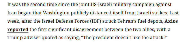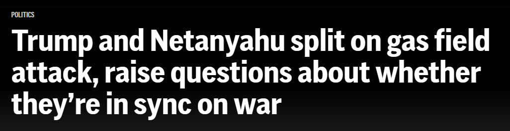3月19日,以方似乎印证了美国的“毫不知情”,以总理内塔尼亚胡在一场新闻发布会上回答媒体提问时称,是以色列“单独”空袭了伊朗天然气田,以方将“遵守”美国总统特朗普所提“暂停”后续空袭能源设施的要求。美以似乎“步调一致”。