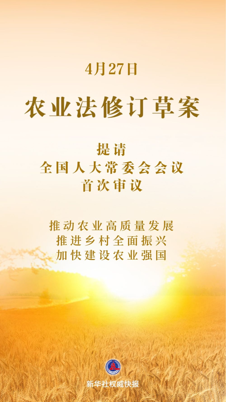 农业法修订草案4月27日提请十四届全国人大常委会第二十二次会议首次审议。此次修订旨在进一步巩固和加强农业在国民经济中的基础地位,坚持大农业观、大食物观,推动农业高质量发展,推进乡村全面振兴,加快建设农业强国,为实现农业农村现代化提供有力法治保障。